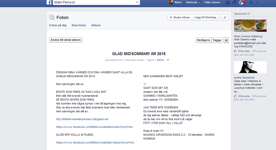 Jag skriver av REN ÄRLIGHET , HÅLLER MIG UPP RIKTIGT SANNING. OM VILL VETA MERA OM MIG. Hjärtligt Värlkomne. https://www.facebook.com/MalinLinneaPersson/about?lst=565694232%3A565694232%3A1508841446§ion=bio&pnref=about